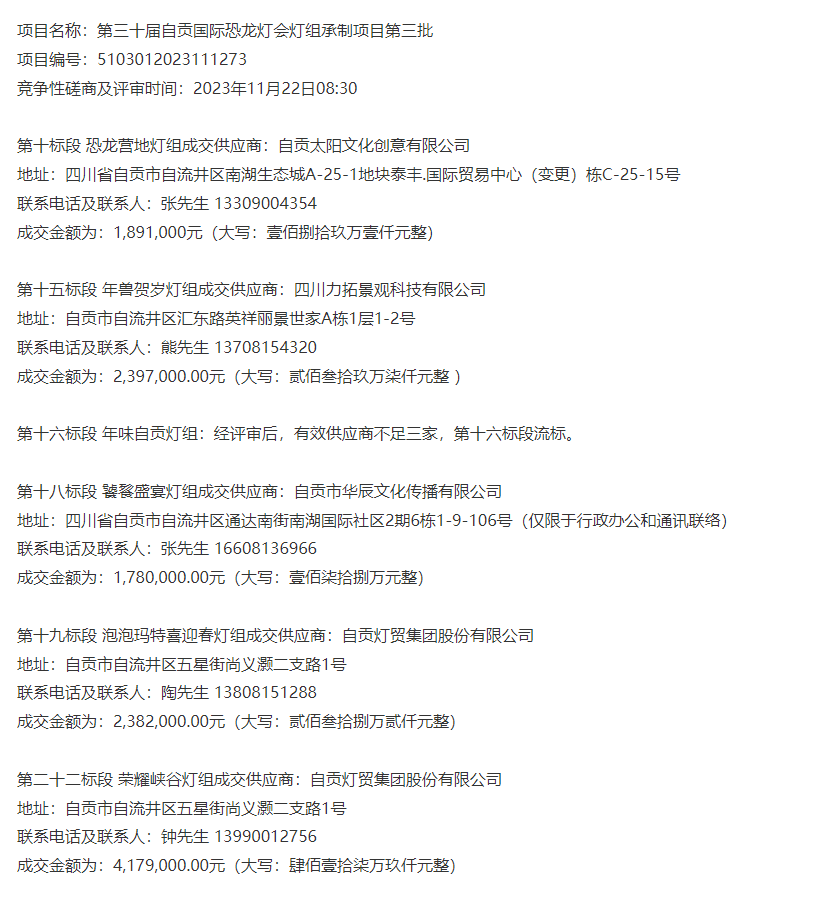 第三十屆自貢國(guó)際恐龍燈會(huì)燈組承制項(xiàng)目第三批競(jìng)爭(zhēng)性磋商成交公告