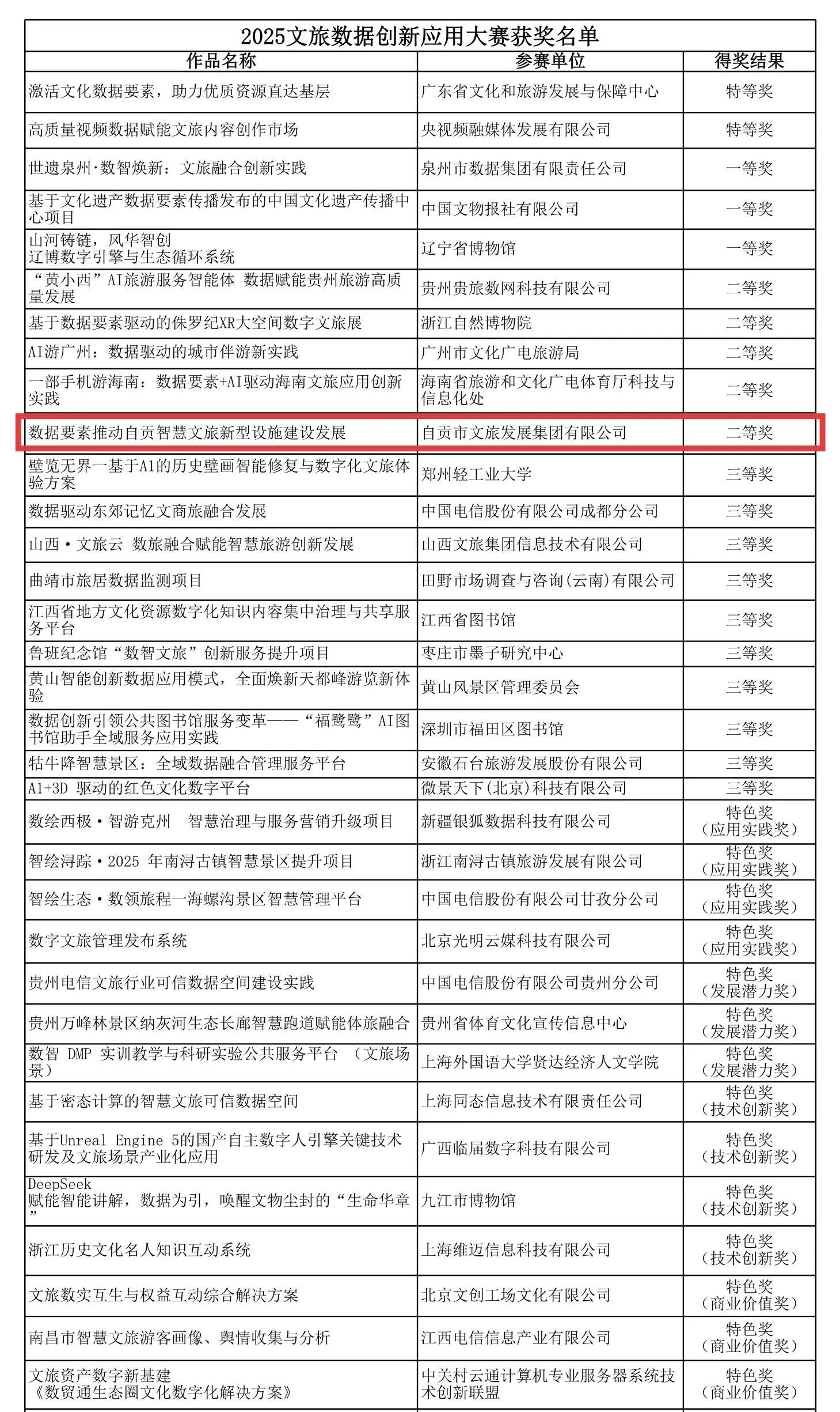 由文化和旅游部科技教育司指導(dǎo),中國(guó)文化傳媒集團(tuán)、中電信文宣科技(北京)有限公司聯(lián)合主辦,中傳文旅(北京)文化發(fā)展有限公司與中國(guó)電信文宣產(chǎn)業(yè)研究院共同承辦的“數(shù)據(jù)賦能 乘數(shù)而上”2025文化和旅游數(shù)據(jù)創(chuàng)新應(yīng)用大賽已結(jié)束。自貢市文旅發(fā)展集團(tuán)有限公司憑借作品“數(shù)據(jù)要素推動(dòng)自貢智慧文旅新型設(shè)施建設(shè)發(fā)展”脫穎而出,成功斬獲二等獎(jiǎng)。