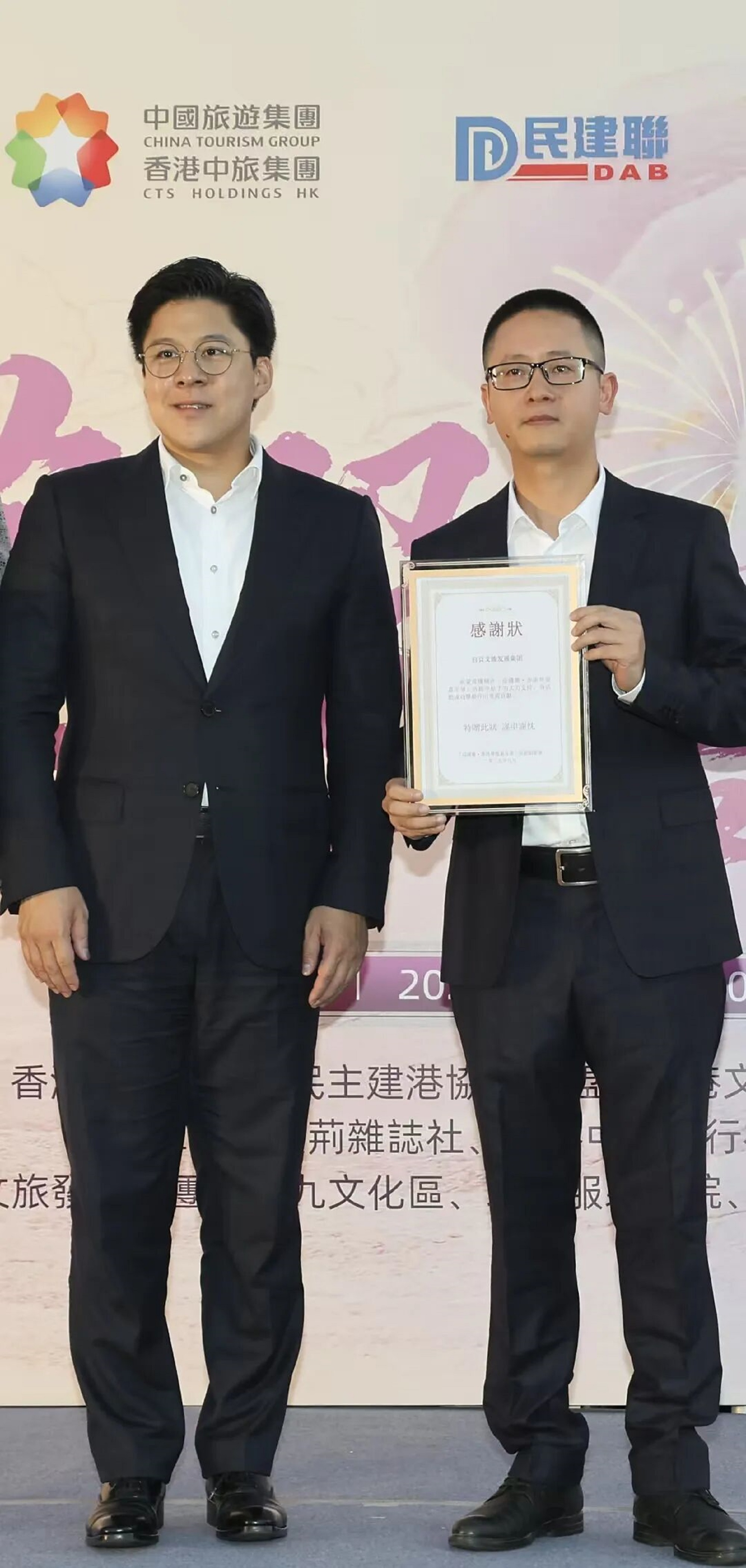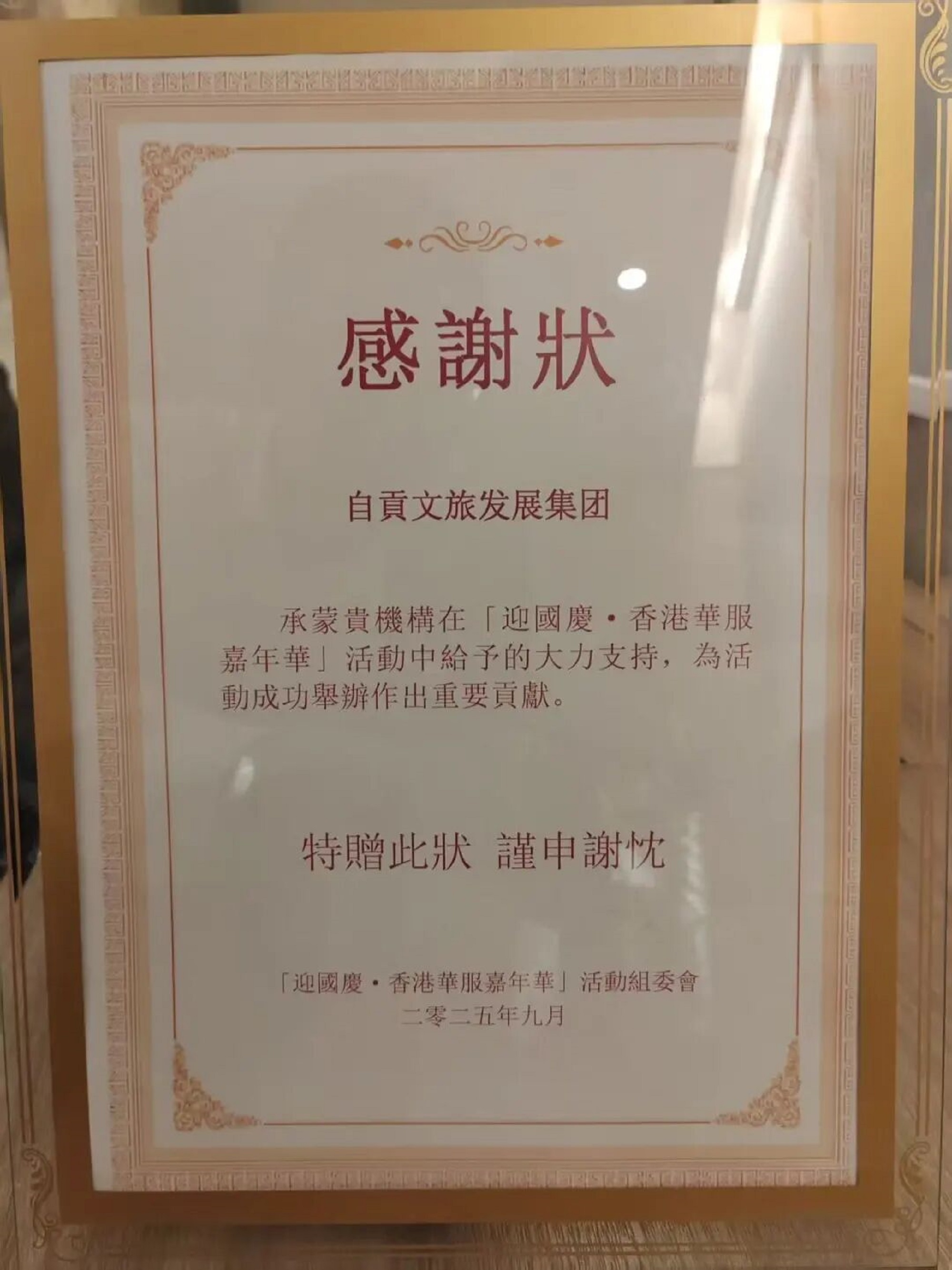 活動現(xiàn)場,霍啟剛代表組委會向自貢文旅集團(tuán)頒發(fā)感謝狀。自貢文旅集團(tuán)表示將持續(xù)發(fā)力——自貢彩燈承載千年文化底蘊,凝聚無數(shù)工匠心血,既是藝術(shù)瑰寶,也是文化交流使者。此次華服彩燈嘉年華,愿為廣大香港市民呈現(xiàn)最優(yōu)的中華彩燈作品,傳遞中華優(yōu)秀傳統(tǒng)文化魅力!